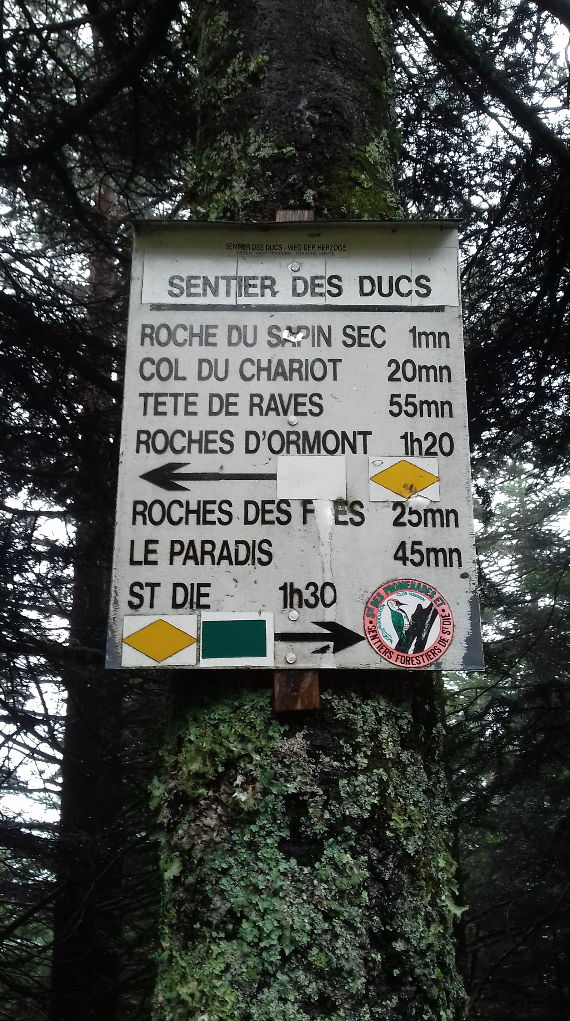 8 participants ainsi que Filou, compagnon à 4 pattes devenu fidèle de nos sorties, ont bravé la pluie incessante. Cette boucle à travers le massif de l’Ormont a permis de découvrir de nombreux rochers pittoresques et vestiges de la guerre 1914 / 1918. Heureusement, un abri à mi-parcours fut le bienvenu pour se restaurer au sec, tout près de la Roche du Sapin Sec. Mais la météo couverte ne nous a laissé entrevoir aucun panorama. Pourtant, nous étions proches du Paradis (lieu-dit près de St Dié).