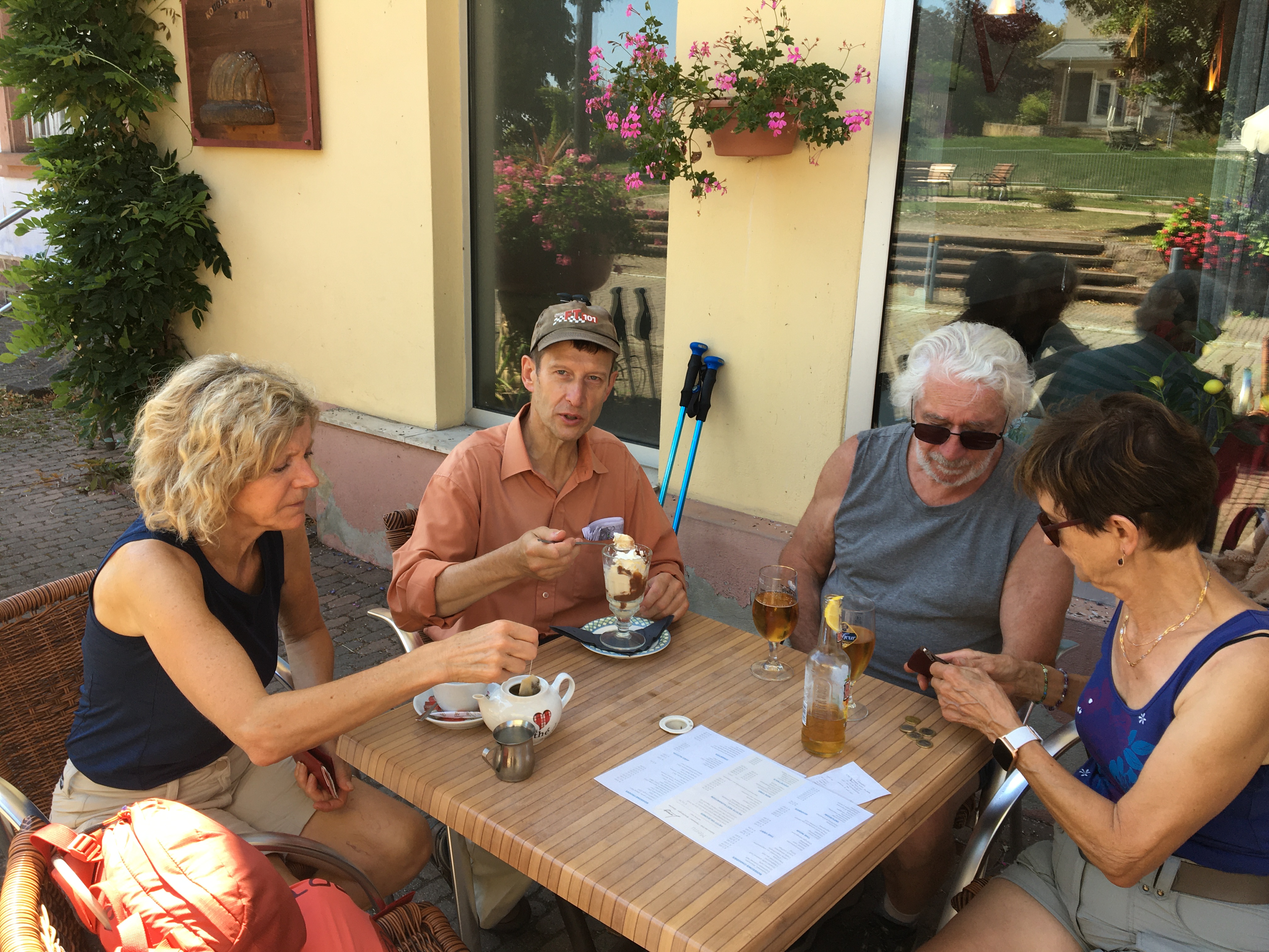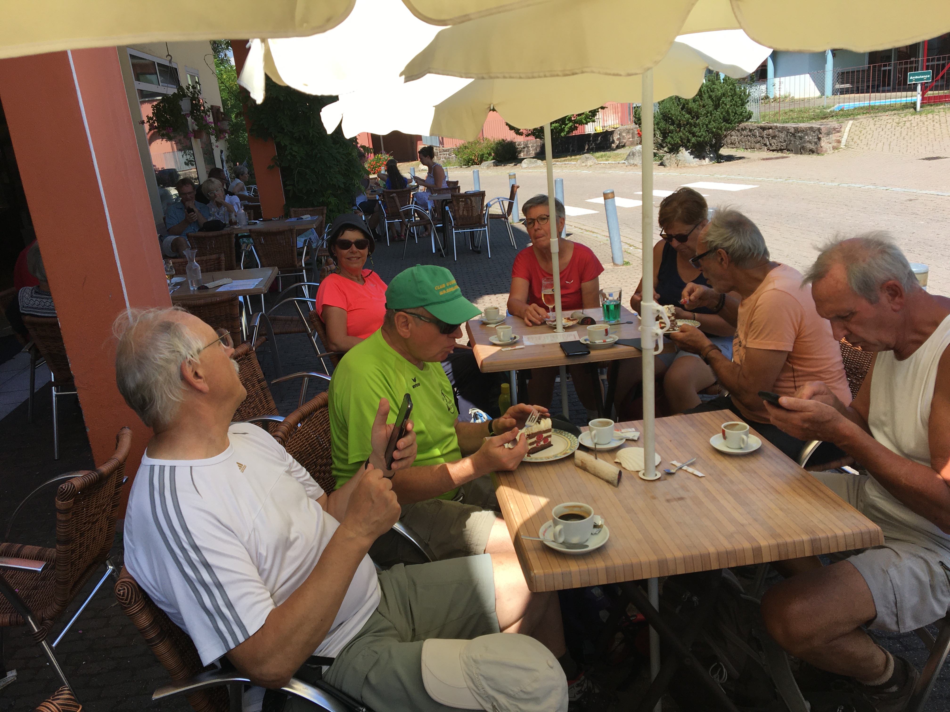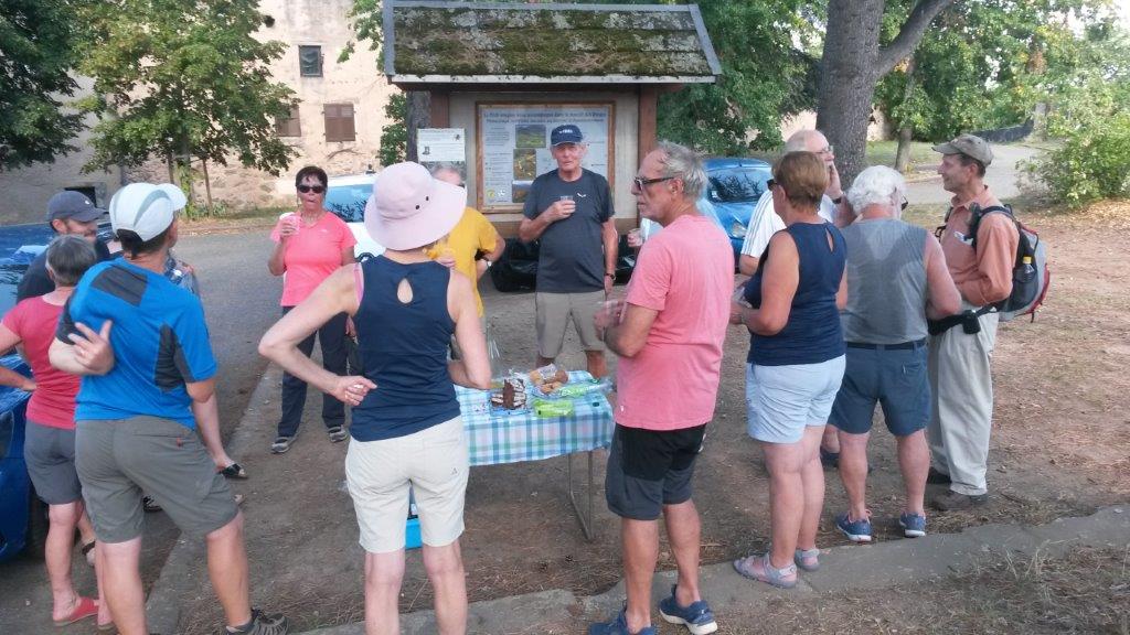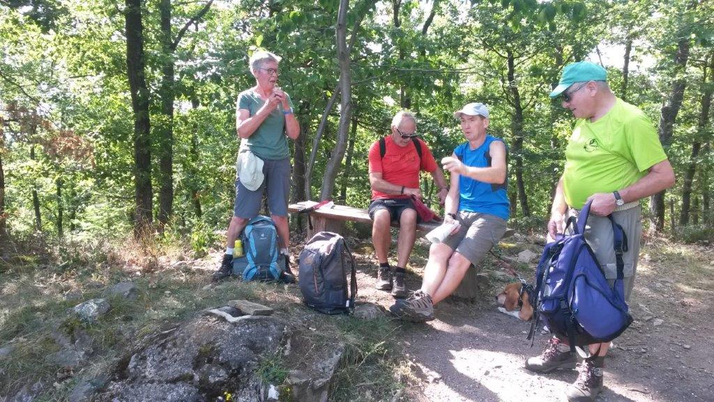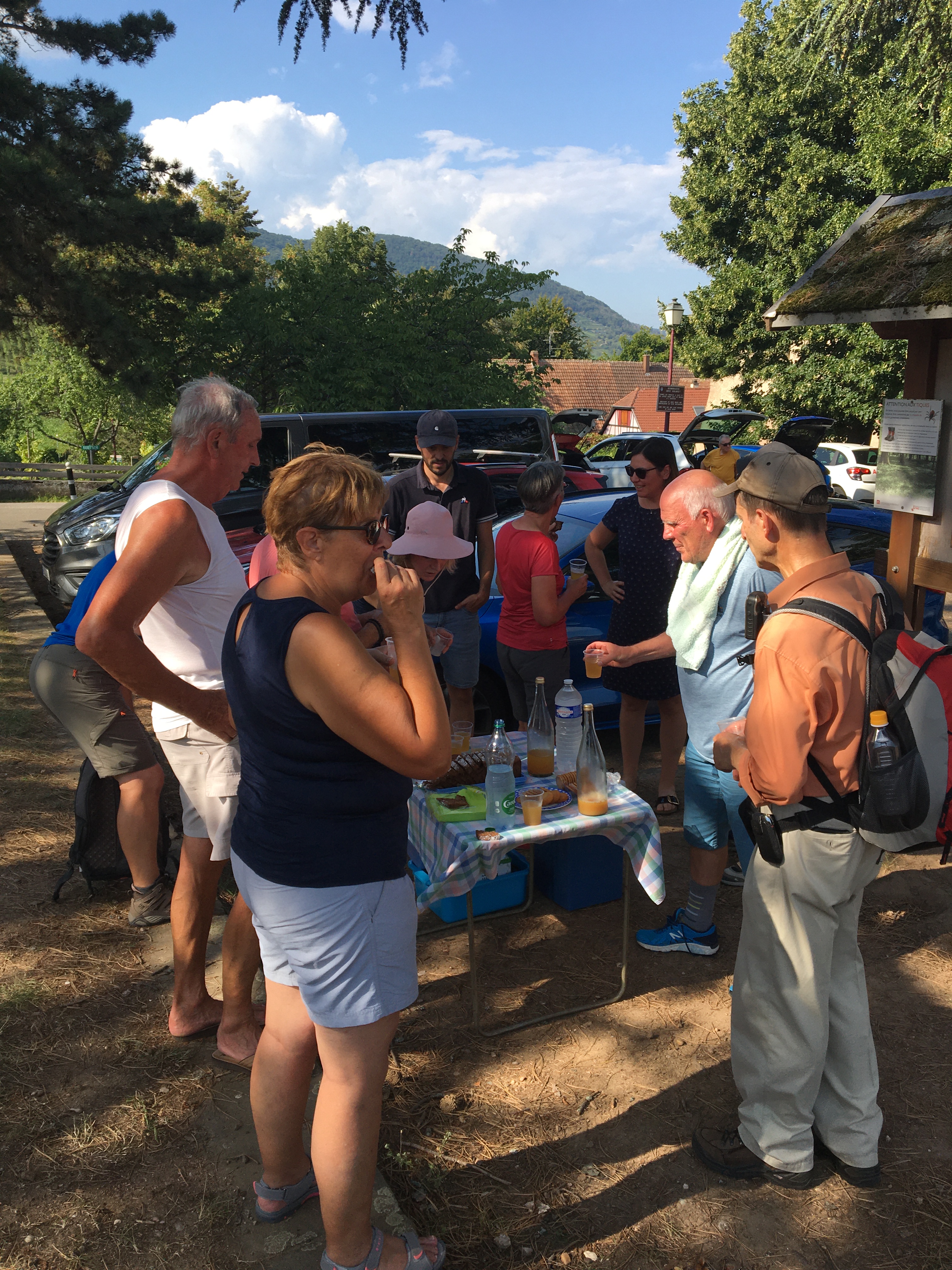 Randonnée en commun avec le CV de Wasslonne au départ d’Ammerschwihr en direction des 3 épis en passant au belvédère du Galtz. Du haut du belvédère, superbes vues à 360° sur la plaine. Sur le chemin du retour, point du vue au rocher du Pfaffenrod; Ensuite descente vers Katzenthal avec vue sur le château du Wineck au sortir de la forêt. Par ce temps chaud, de nombreuses pauses rafraichissantes sont les bienvenue comme ce pot surprise qui attendait les 14 courageux randonneurs sur le parking du retour.