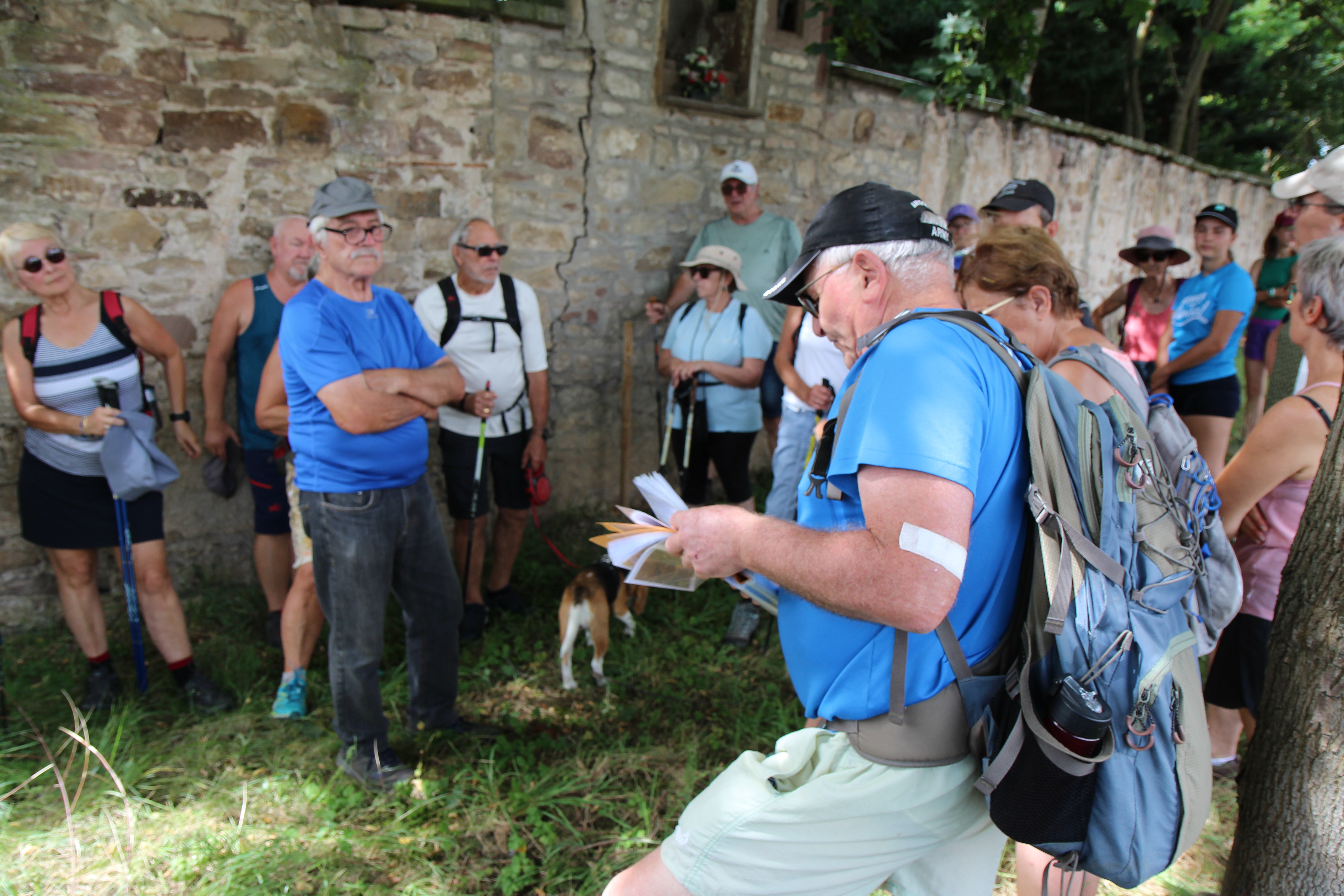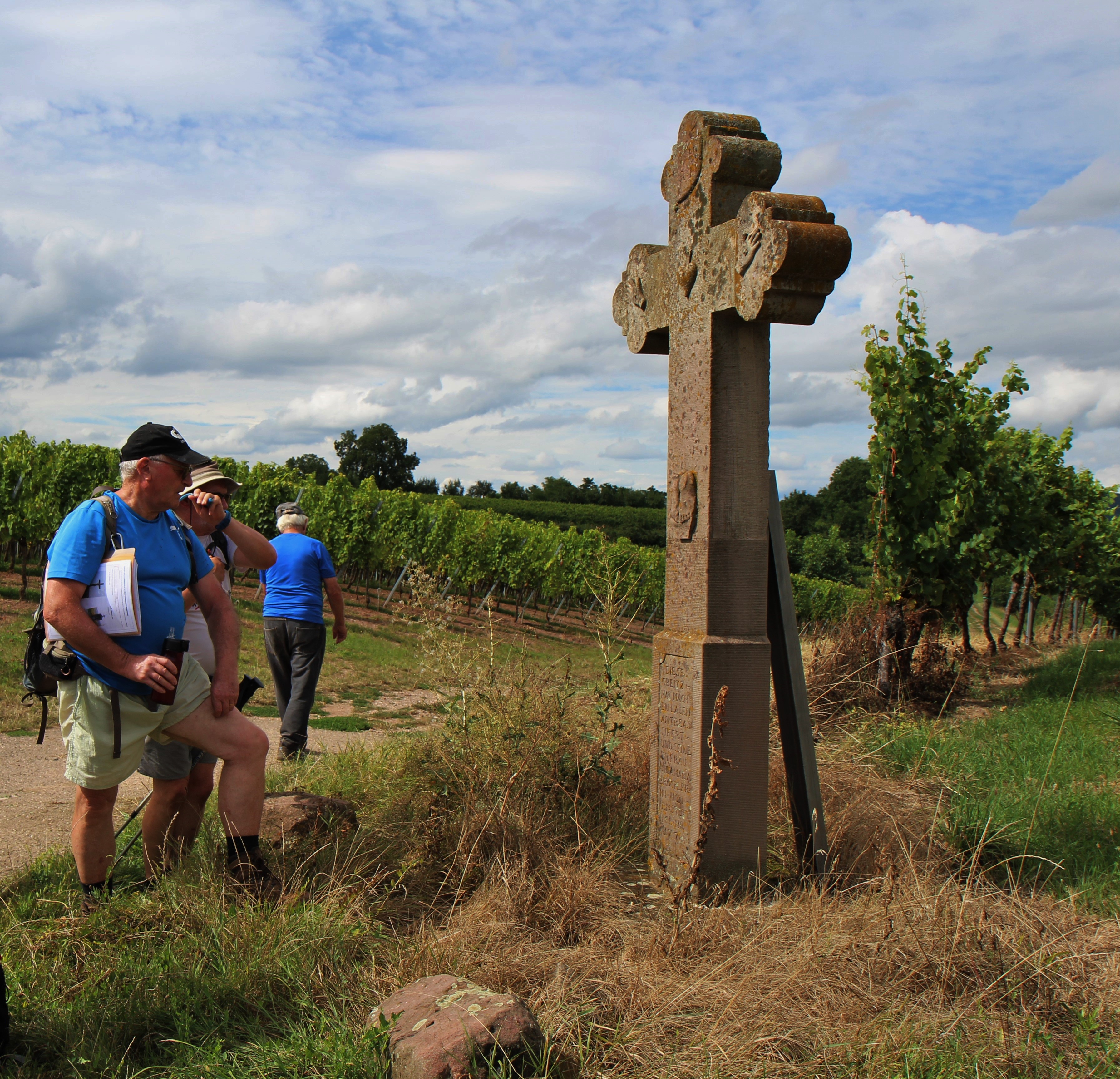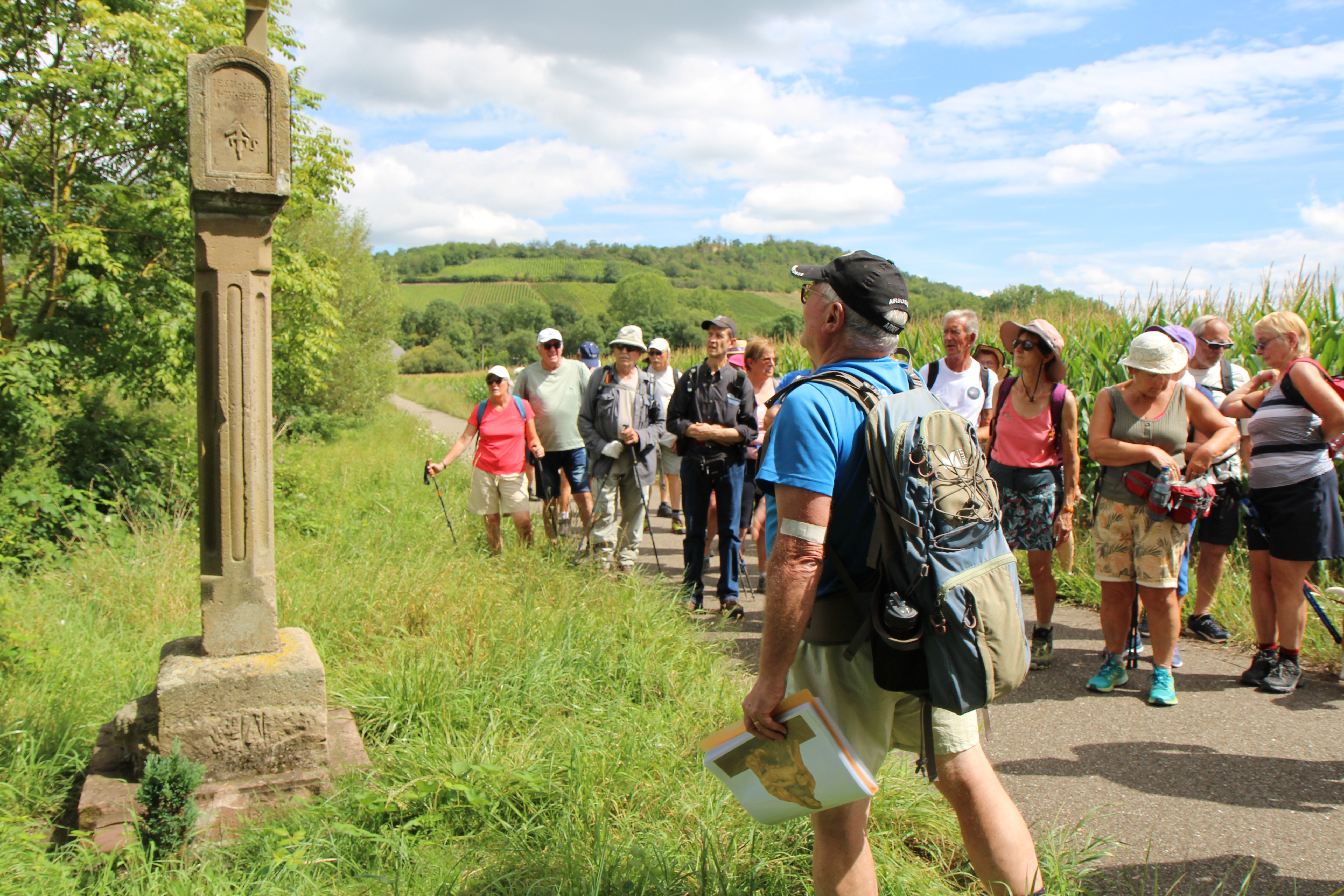 Sous un soleil éclatant, randonnée sur les hauteurs de Soultz les Bains pour découvrir une partie du circuit des croix (distance 7 km – dénivelé 200 m). Commentaires et explications de Bernard Zerr.