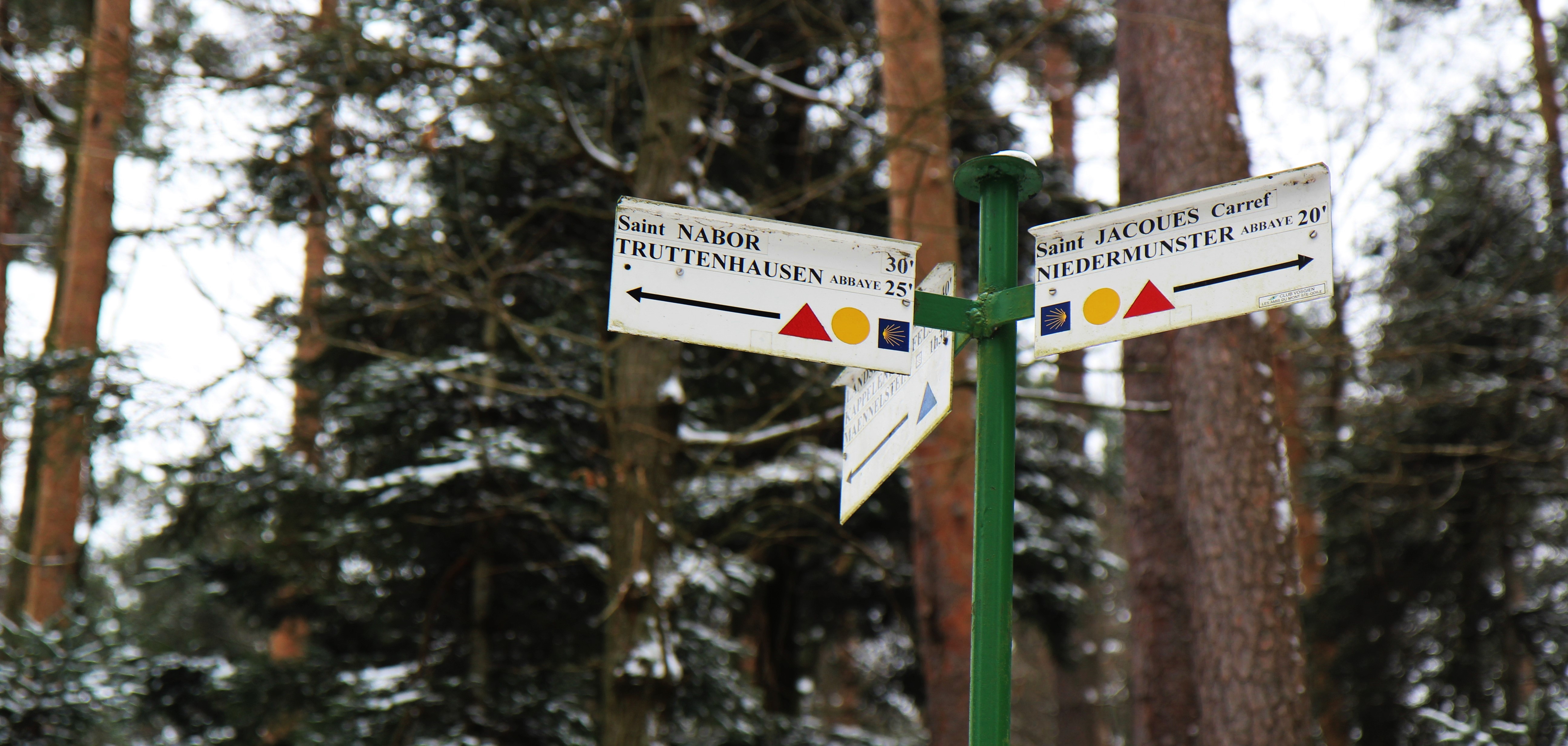 Arrêt aux ruines de la chapelle St Jacques puis descente vers l’abbaye de Truttenhausen et sa ferme.