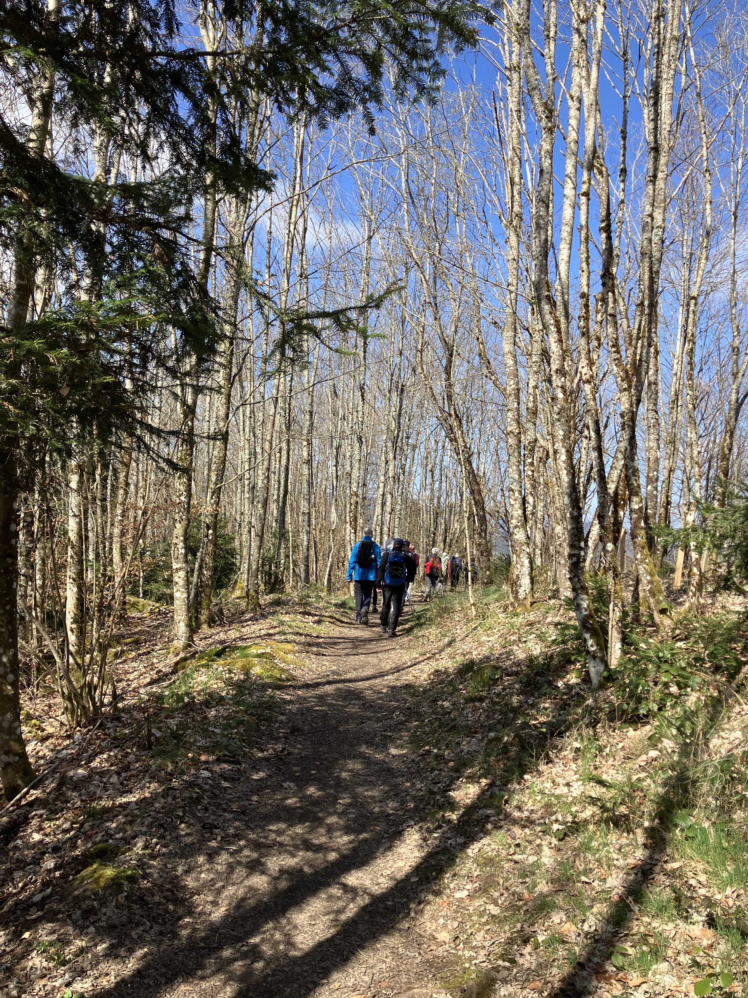 Merci à Mireille et Christian, guides du jour, pour cette sortie printanière sur les hauteurs de Rothau en passant à Wildesbach, col du Perheux, puis le tour du Mont St Jean, Solbach. Le groupe de 18 randonneurs a tiré son repas du sac au refuge de la Sapinière où un bon feu les attendait. Retour par le chenot.