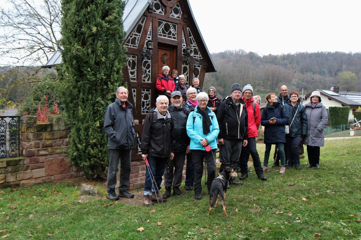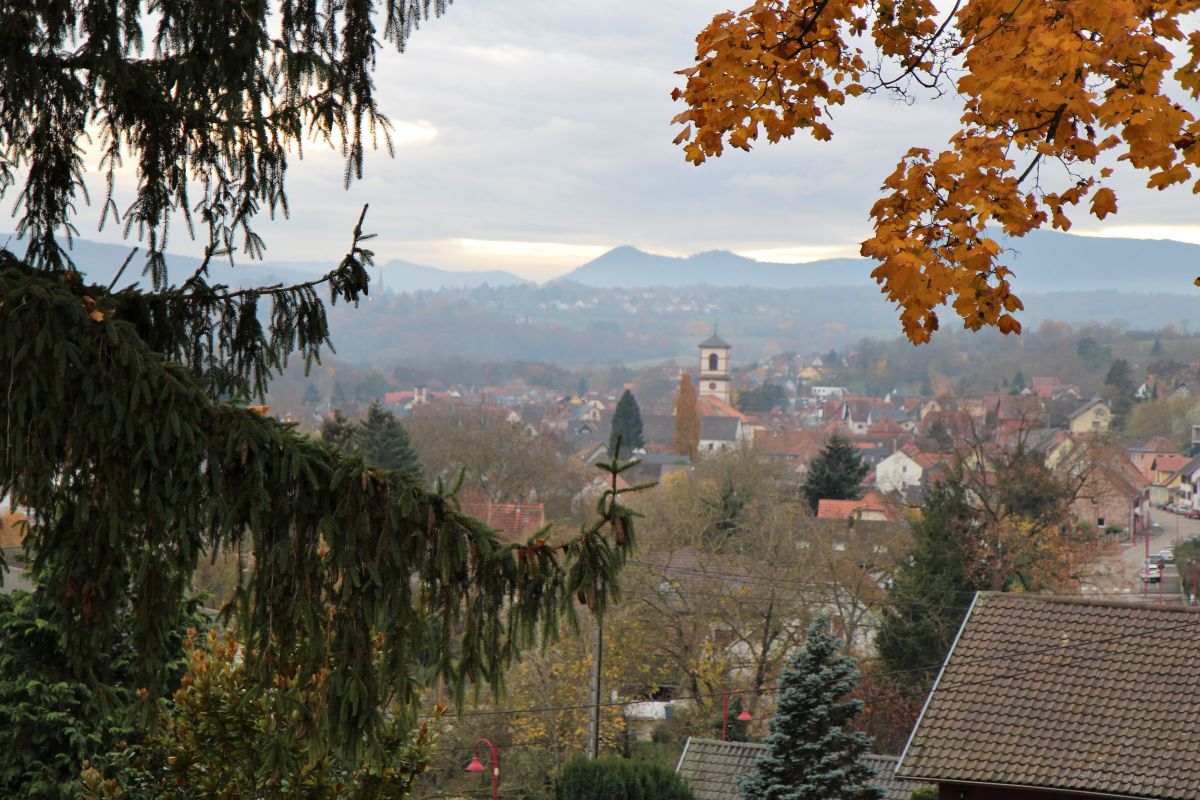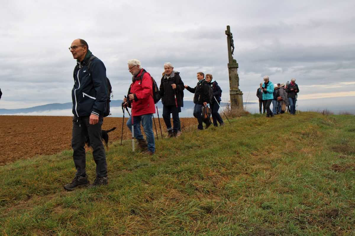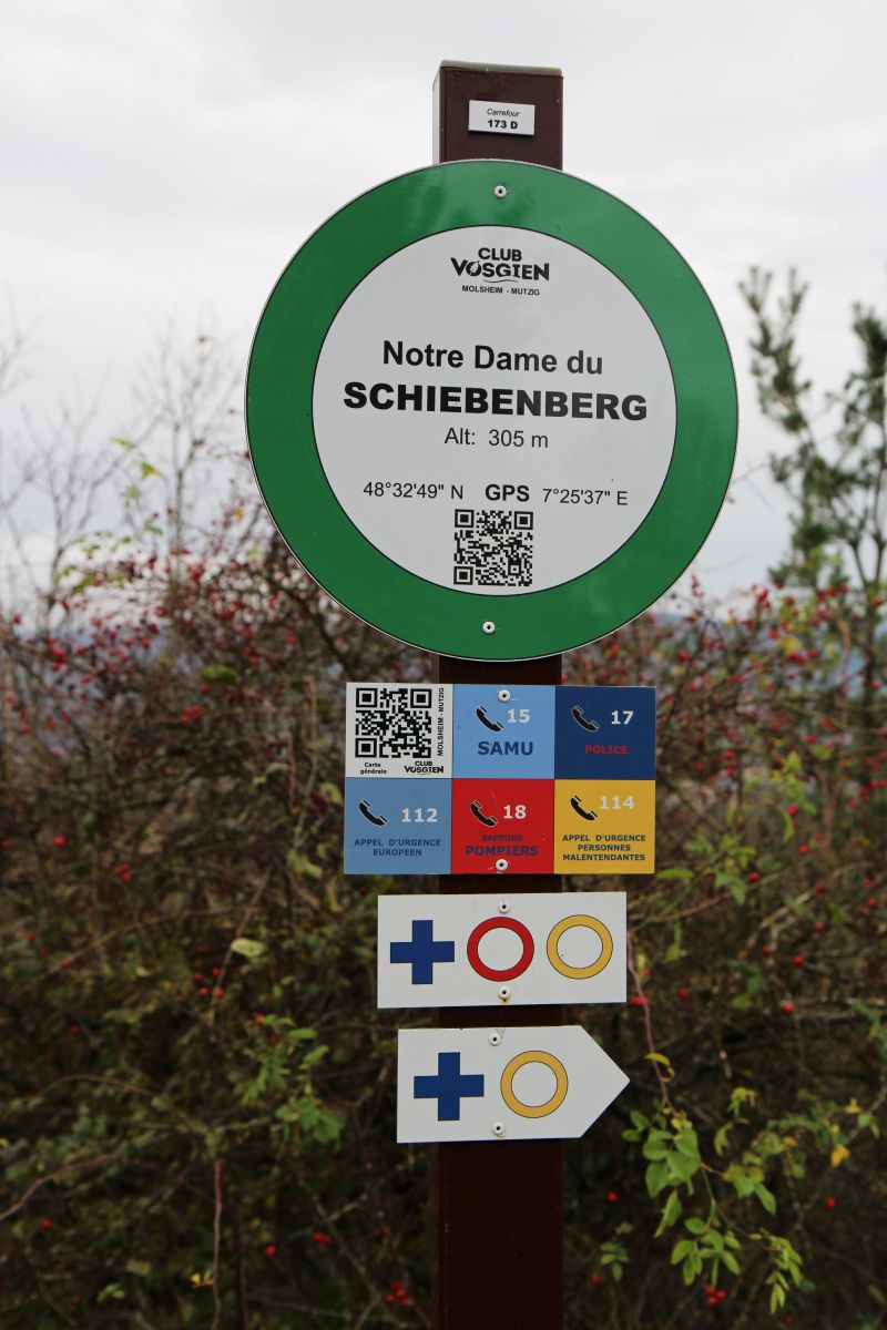 Départ de la randonnée à DINSHEIM SUR BRUCHE -Parking du Foyer Communal. Circuit : montée à la statue de Notre Dame du Schiebenberg – le Brenner – au retour passage au jardin folâtre.