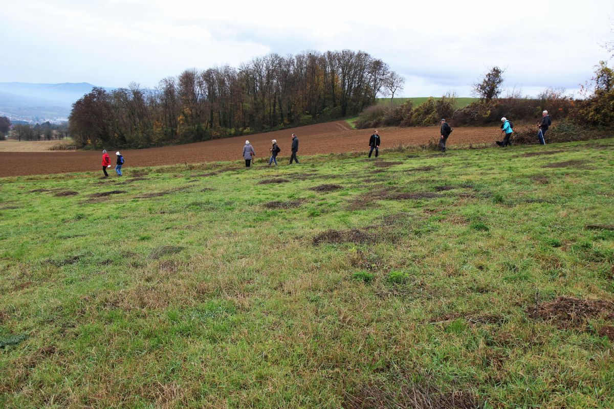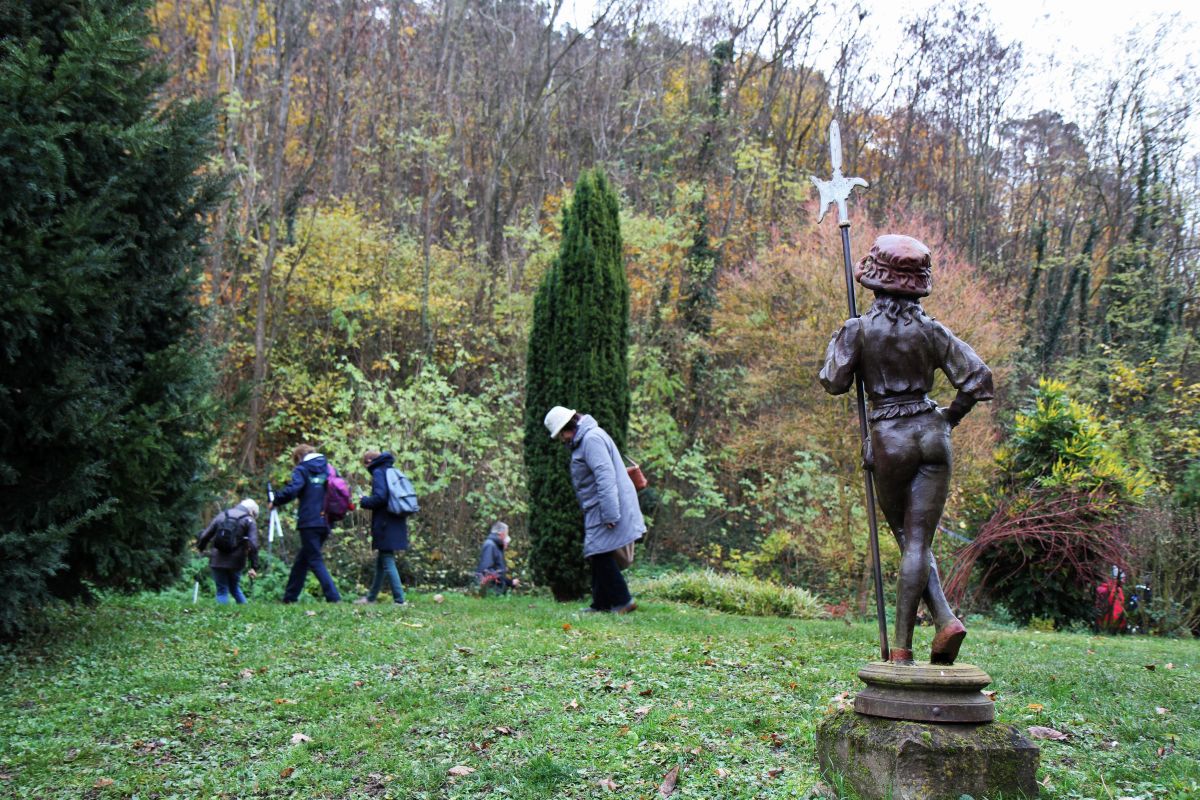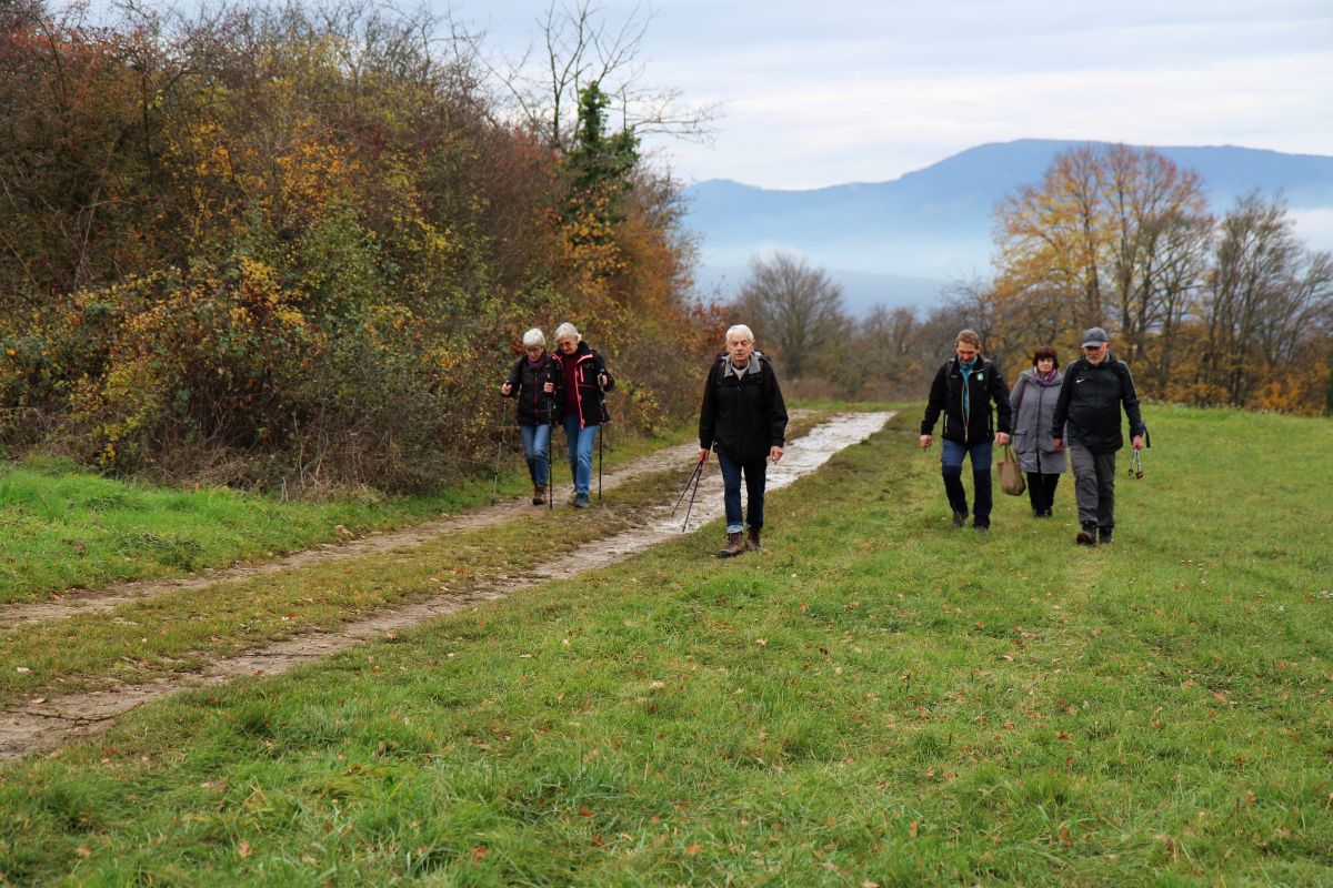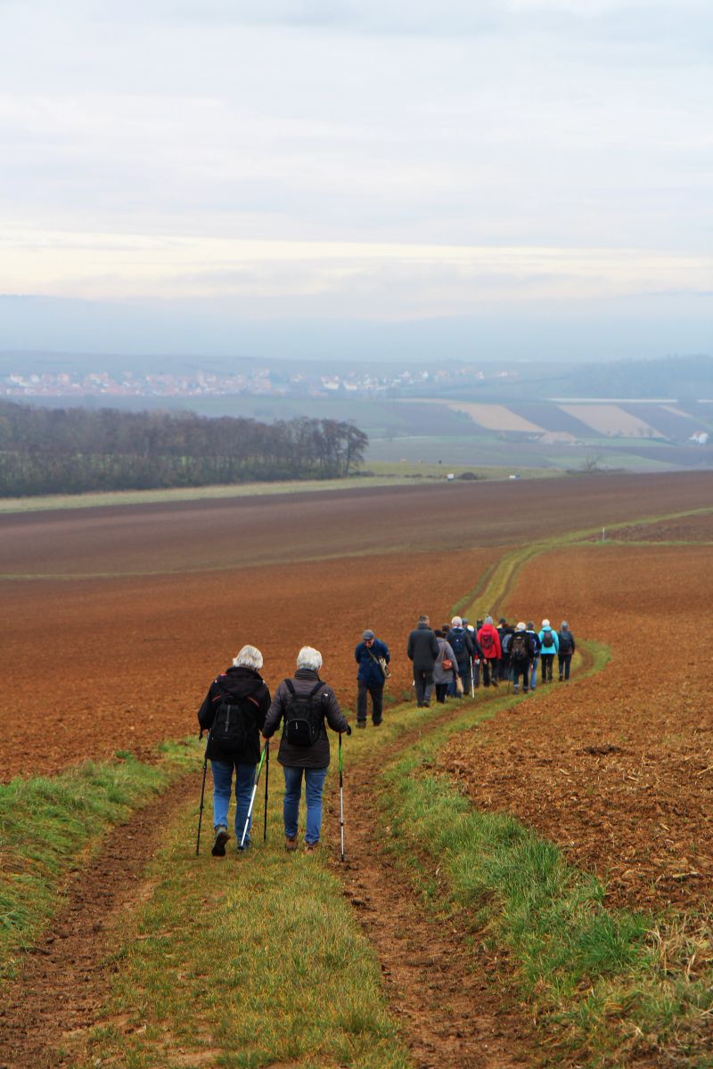 Départ de la randonnée à DINSHEIM SUR BRUCHE -Parking du Foyer Communal. Circuit : montée à la statue de Notre Dame du Schiebenberg – le Brenner – au retour passage au jardin folâtre.