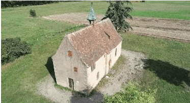 Ce petit édifice avec une abside à trois pans possède au-dessus de la porte sud un